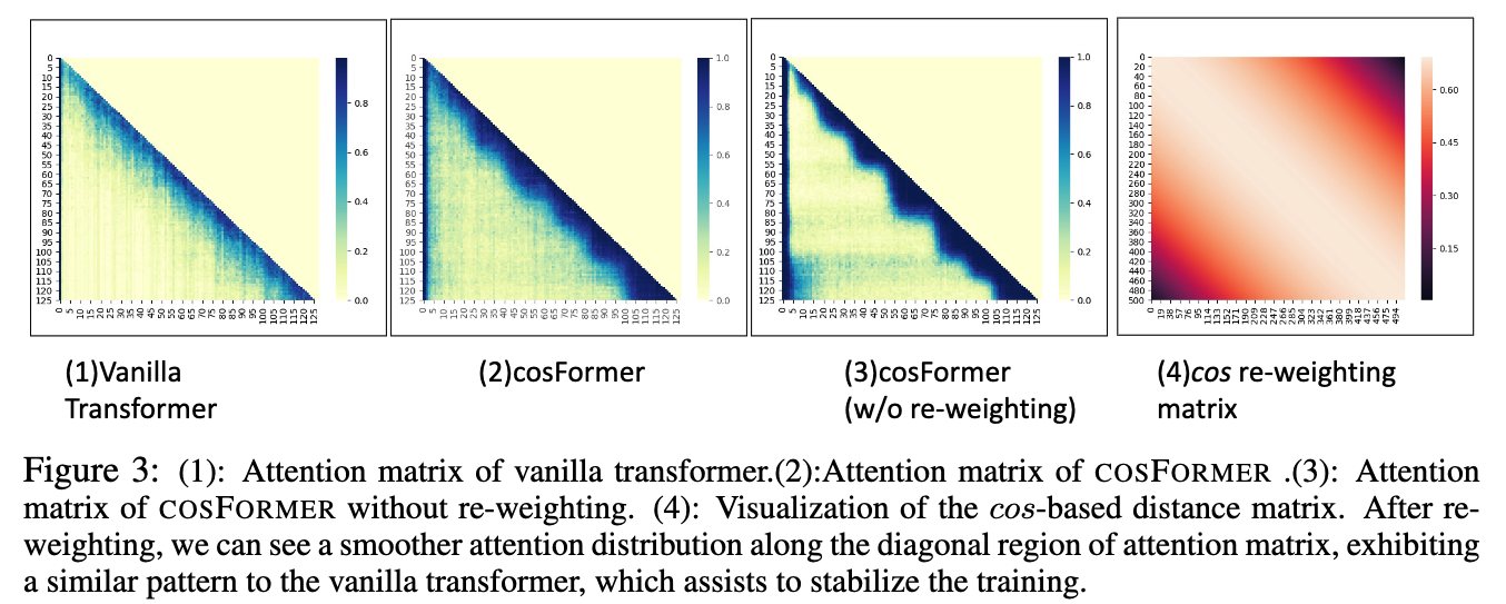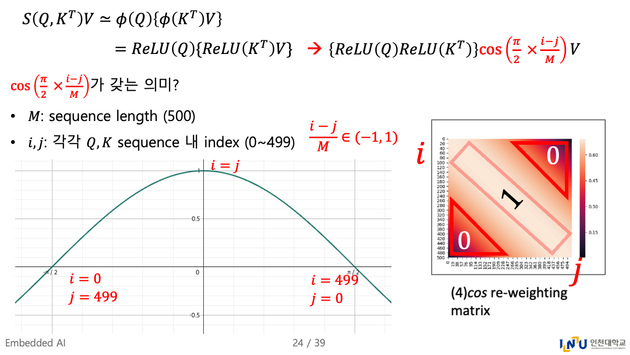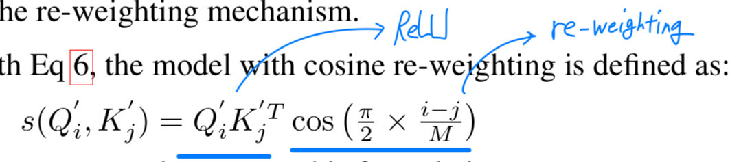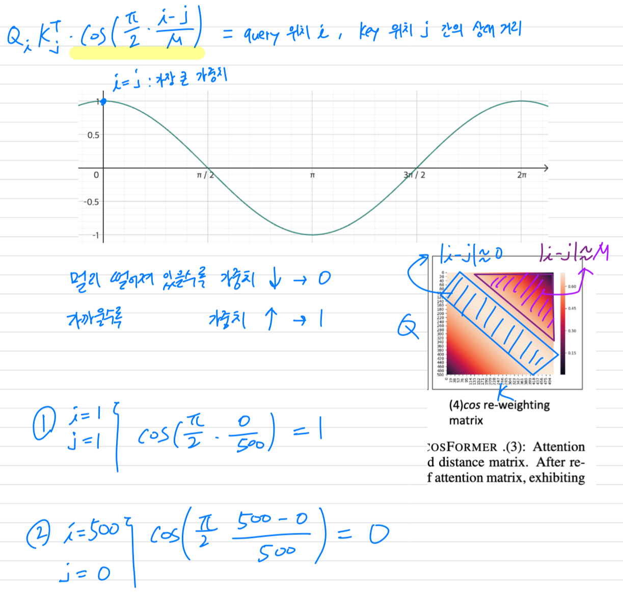 - CosFormer는 ReLU-based linear simlarity function의 2.에서 re-weighting scheme이 없는 것을 보완하기 위해 cos-based re-weighting mechanism을 제안함.