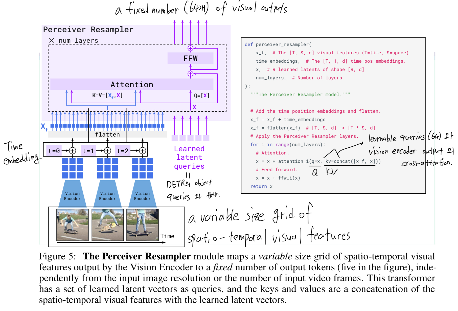 이후 학습 가능한 temporal embeddings을 추가하고, Perceiver Resampler에 입력되기 전에 feature들을 1D로 flattened한다.
