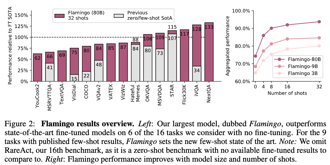 여러 benchmark에서 Flamingo는 수천 배 더 많은 task-specific data를 사용해 fine-tuned model들보다도 outperform한다.