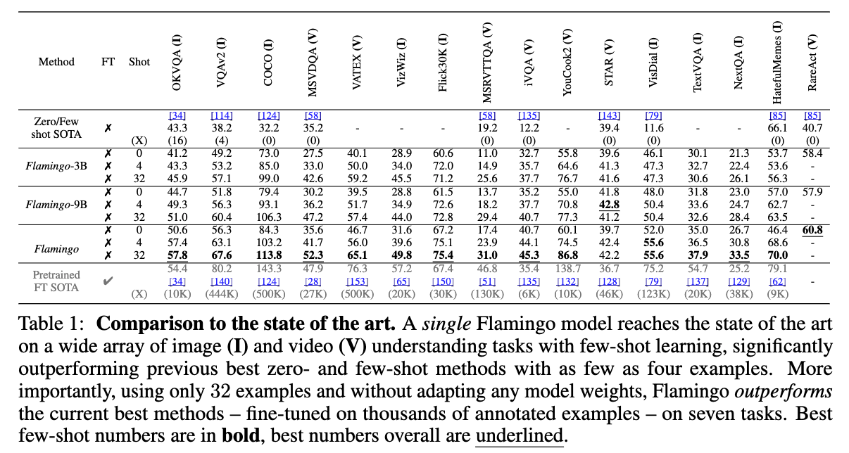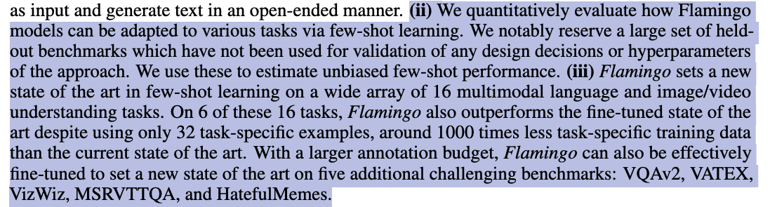 - Flamingo는 fine-tuning 없이, few-shot learning(in-context) 만으로 SOTA 달성 가능.