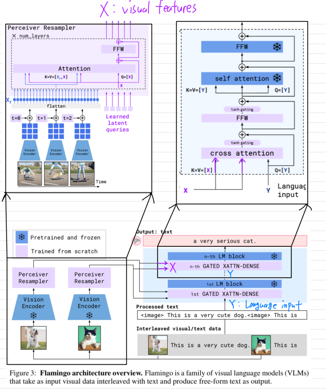Flamingo는 input으로 text token과 image and/or videos token이 임의로 섞여 있는 입력을 받는다는게 다름. text를 출력한다는 것은 동일.)
