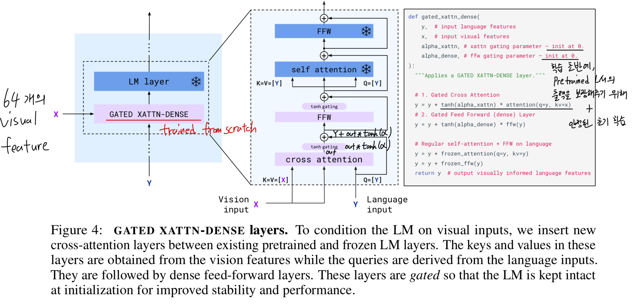 이 cross-attention layers들은 pre-trained LM의 layer들 사이에 interleaved 방식으로 삽입된다.