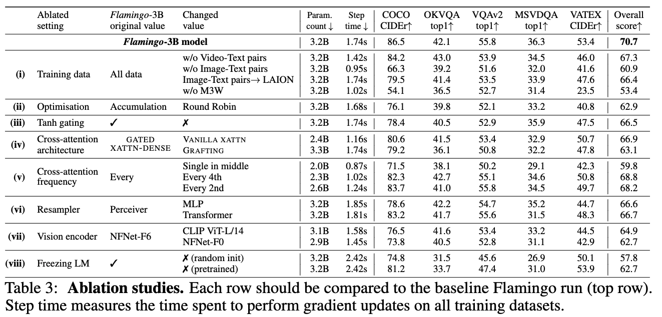Ablation study(Section 3.3)에서는 제안한 GATED XATTN-DENSE layer를 최근 제안된 alternatives [22, 68]과 비교하고,