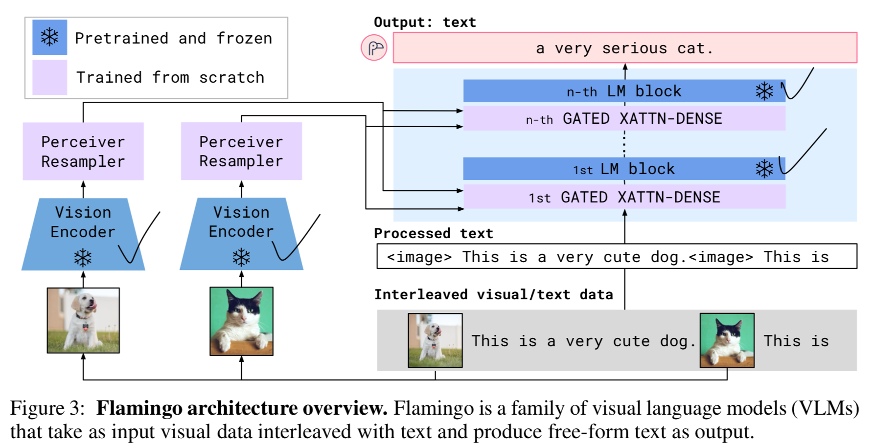 - 이 section에서 Flamingo를 설명하겠다: a VLM that accepts text interleaved with images/videos as input and outputs free-form text.