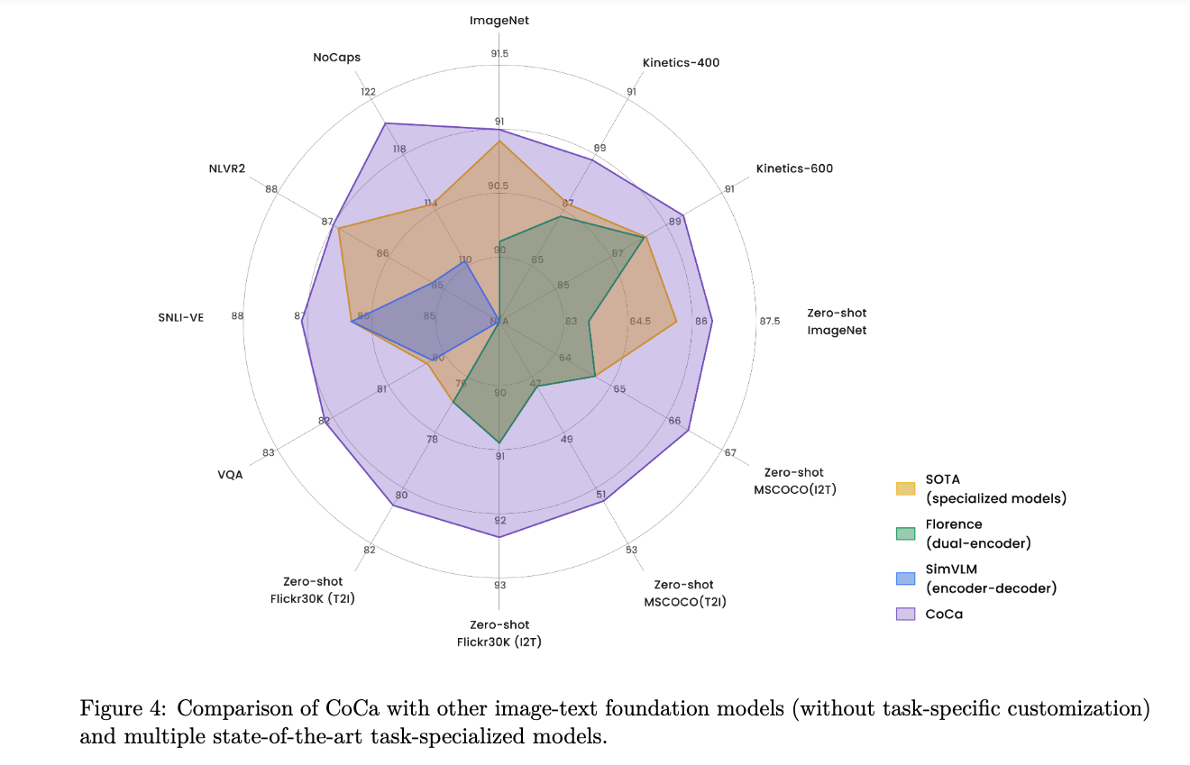 그 결과, 대부분의 연산이 two losses 간에 공유되며, CoCa는 standard encoder-decoder models에 비해 매우 적은 overhead만을 유발한다.