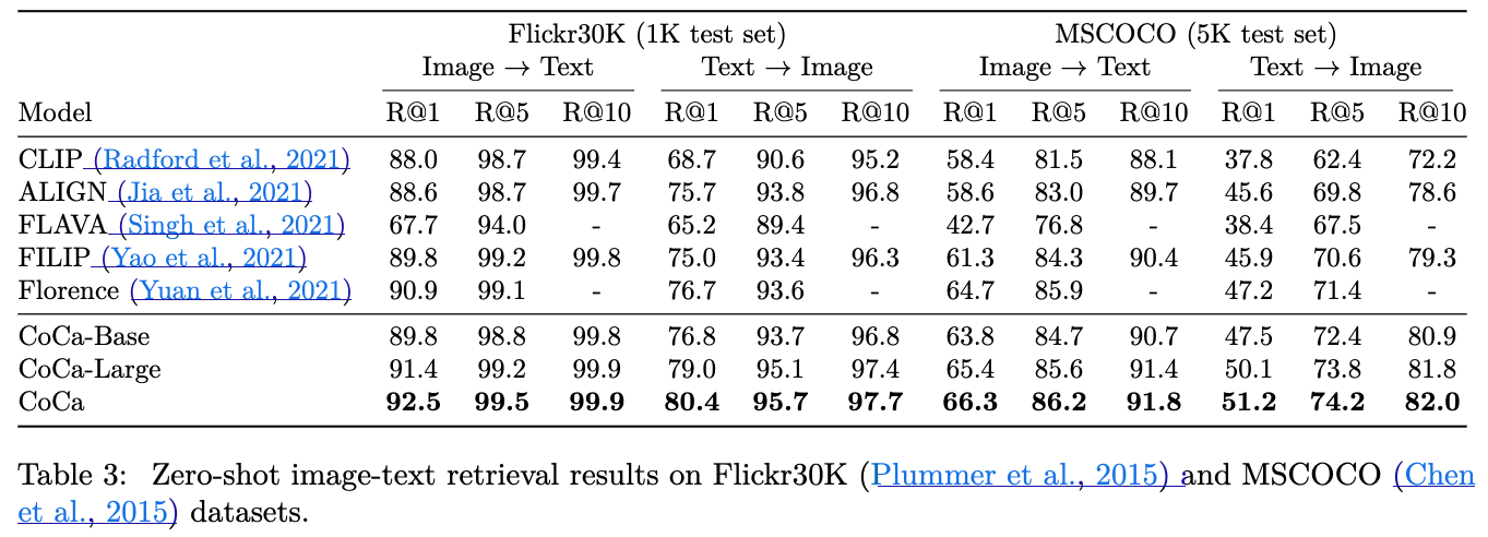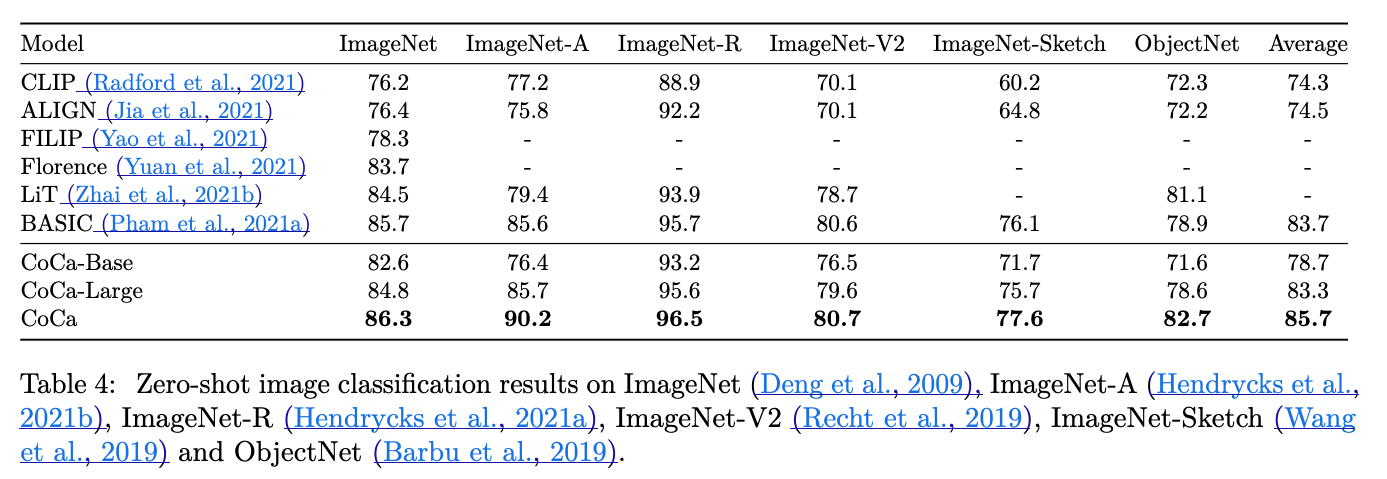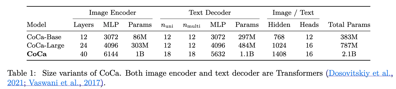 또한 우리는 two smaller variants of "CoCa-Base" and "CoCa-Large"를 Table 1에 자세히 적어놨다.