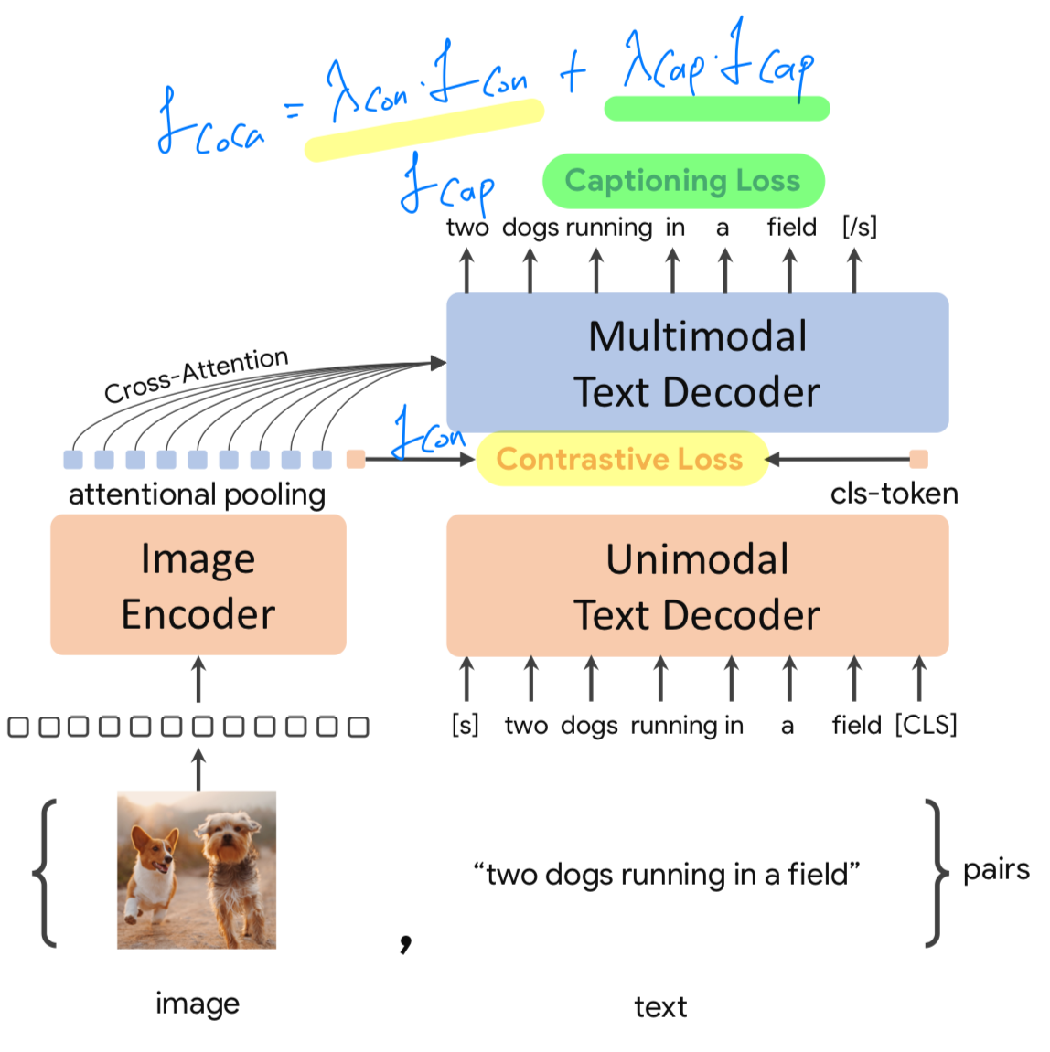 CoCa는 decoder layer의 첫 절반의 layer에서는 cross-attention을 생략하여 unimodal text representations을 encoding하고,