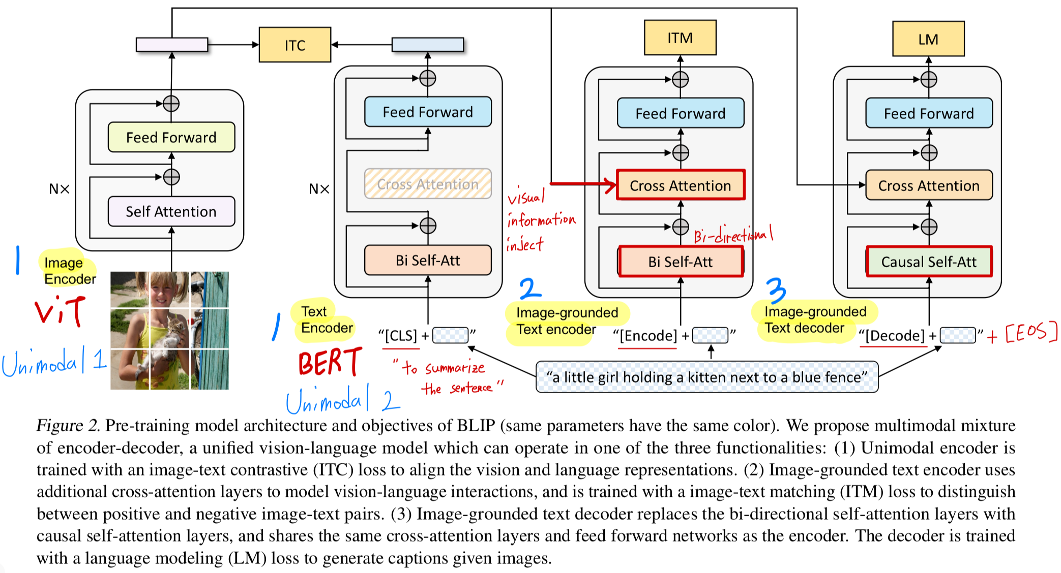 즉, image encoder 1개 + (unimodal=text decoder 1개 + multimodal=image-grounded text decoder 1개)