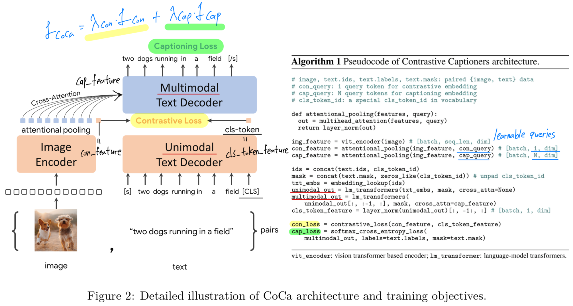 이는 contrastive loss와 captioning(generative) loss를 함께 사용하여 학습되는 a modified encoder-decoder architecture를 갖는다.