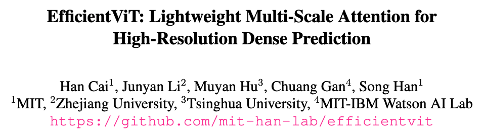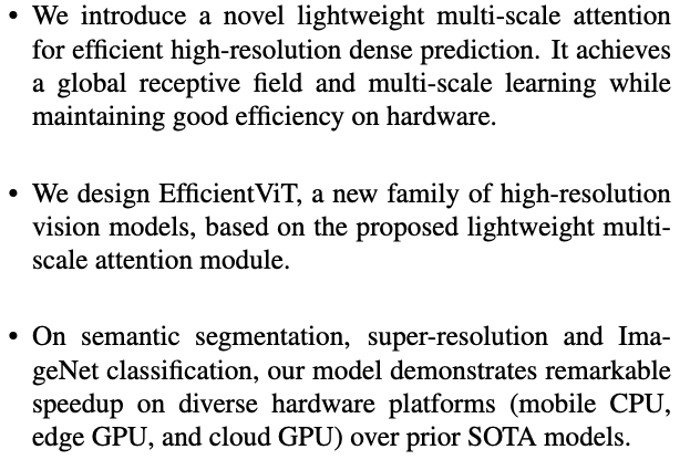 본 연구에서는 EfficientViT, a new family of high-resolution vision models with novel lightweight multi-scale attention을 제안한다.