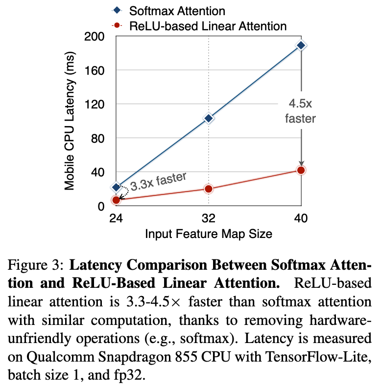 similar computation으로, ReLU-based linear attention은 mobile에서 softmax attention보다 훨씬 빠르다.