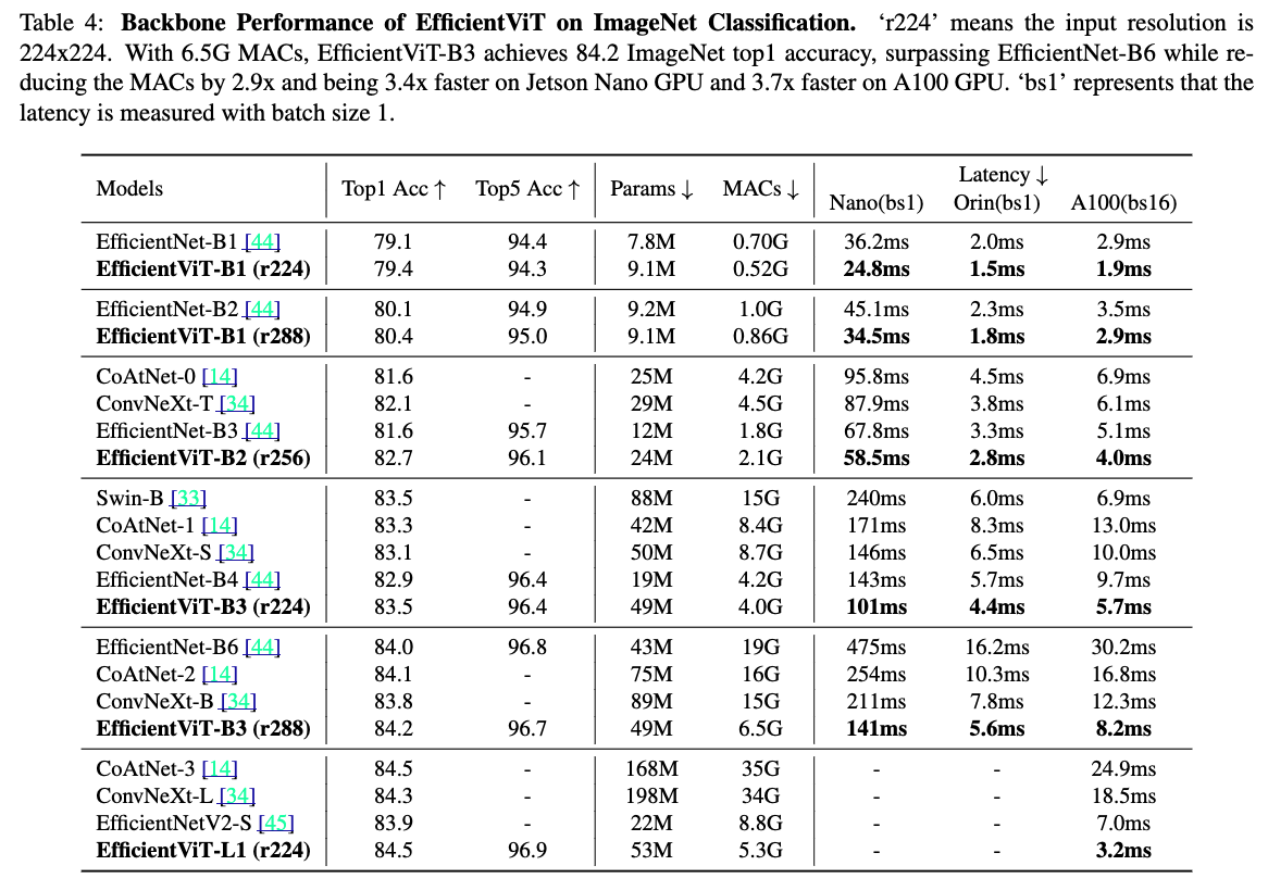 이러한 설계 덕분에 Efficient ViT는 mobile CPU, edge GPU, cloud GPU 등 다양한 HW platform에서 기존 SOTA model보다 눈에 띄는 performance gains과 speedup을 보여준다.
