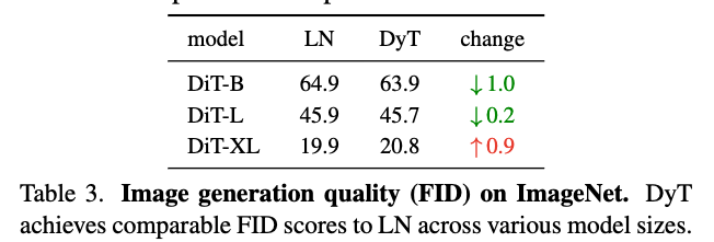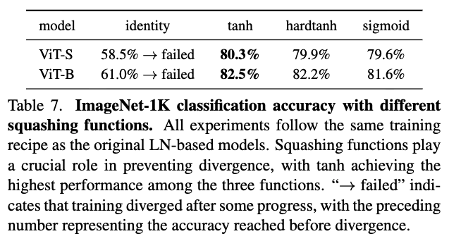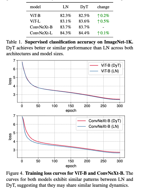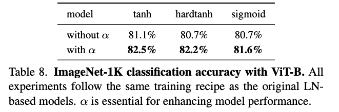DyT의 simplicity에도 불구하고, DyT는 stable training and comparable performance를 달성한다.