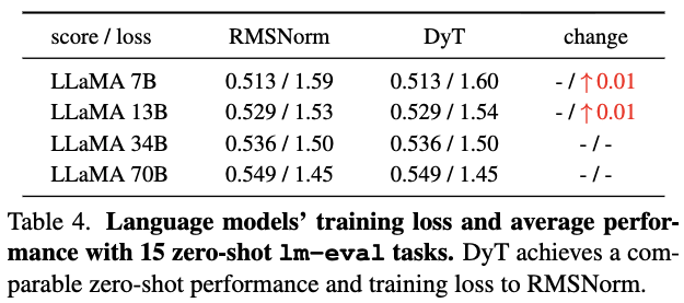하지만 DyT는 입력 텐서 가 들어오면, 학습된 scalar 를 사용하여 element-wise로 즉시 계산하기 때문에 aggregation 과정이 전혀 없다.