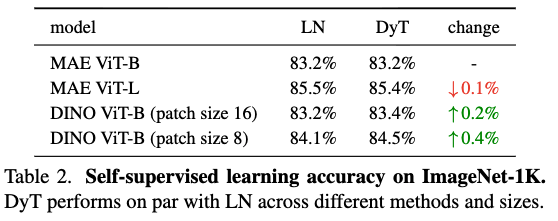 결과적으로, DyT는 self-supervised learning tasks에서 LN과 동등한 성능을 지속적으로 보여준다.