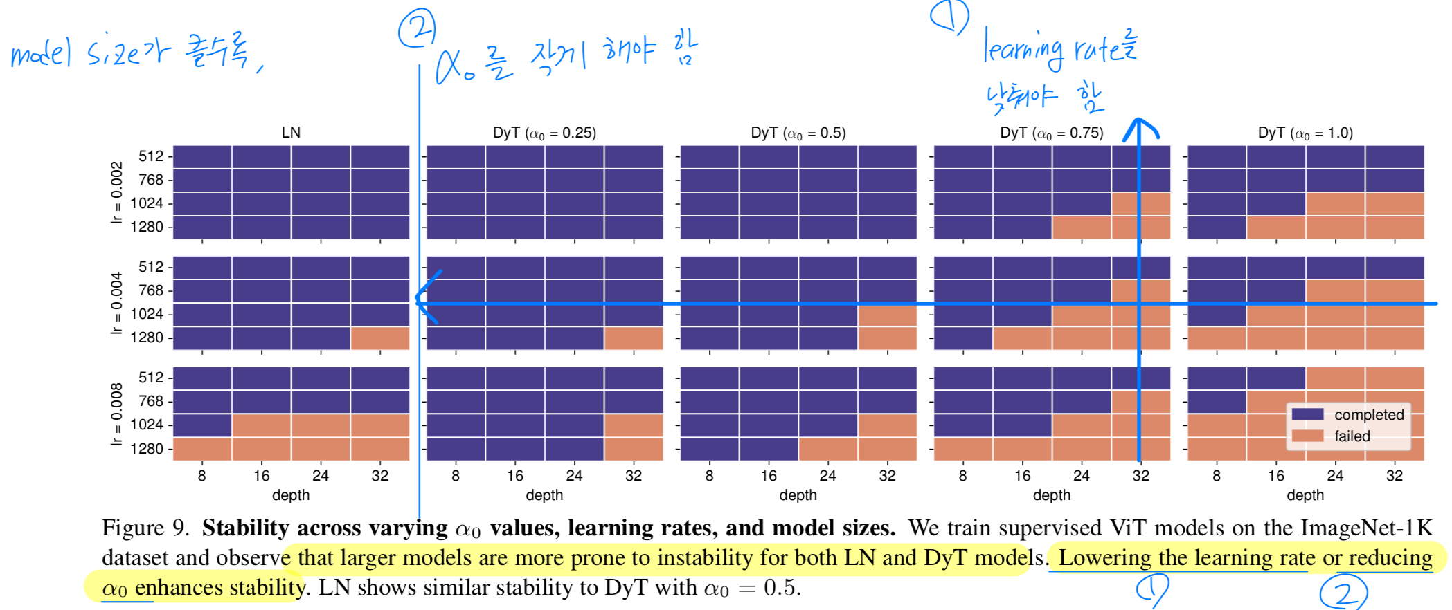 그 결과, model size or the learning rate를 증가하면 학습을 안정시키기 위해 를 낮춰야 한다는 것을 알 수 있다.