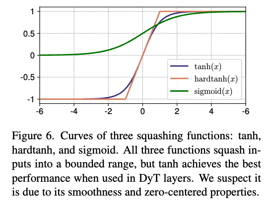 주목할 점: DyT는 새로운 종류의 정규화 레이어는 아닙니다. DyT는 순전파(forward pass) 동안 텐서의 각 입력 요소에 대해 독립적으로 동작하며 통계나 기타 집계 연산을 계산하지 않습니다. 그러나 DyT는 입력의 중심 부분을 거의 선형으로 변환하면서, 극단적인 값들은 비선형 방식으로 압축(squash)하는 정규화 레이어의 효과를 그대로 유지합니다.