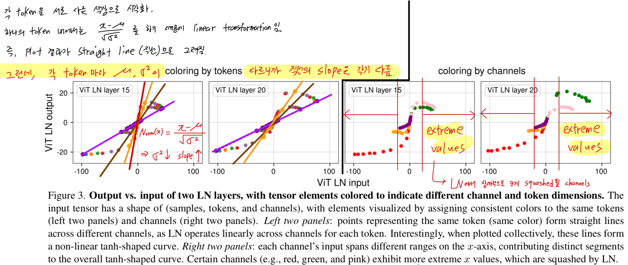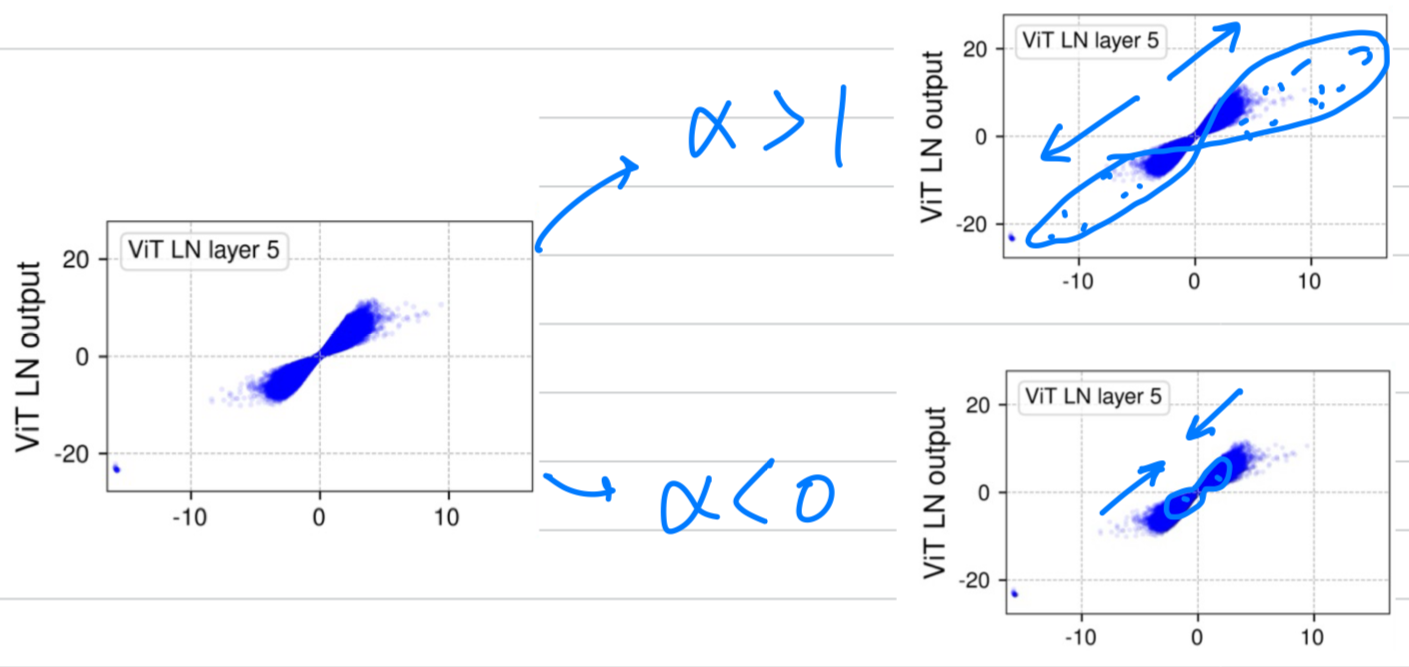 LN layer는 각 token에 대해서 a linear transformation을 수행하면서, 동시에 extreme values를 어떻게 그렇게 non-linear 방식으로 squash할 수 있을까?