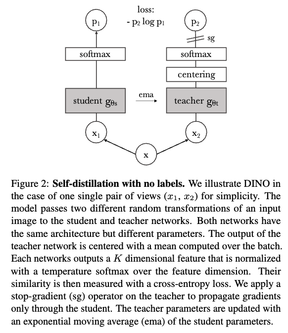 DINO는 DIstillation with NO labels의 약자로, 레이블 없이 지식 증류(knowledge distillation)를 사용하는 방식