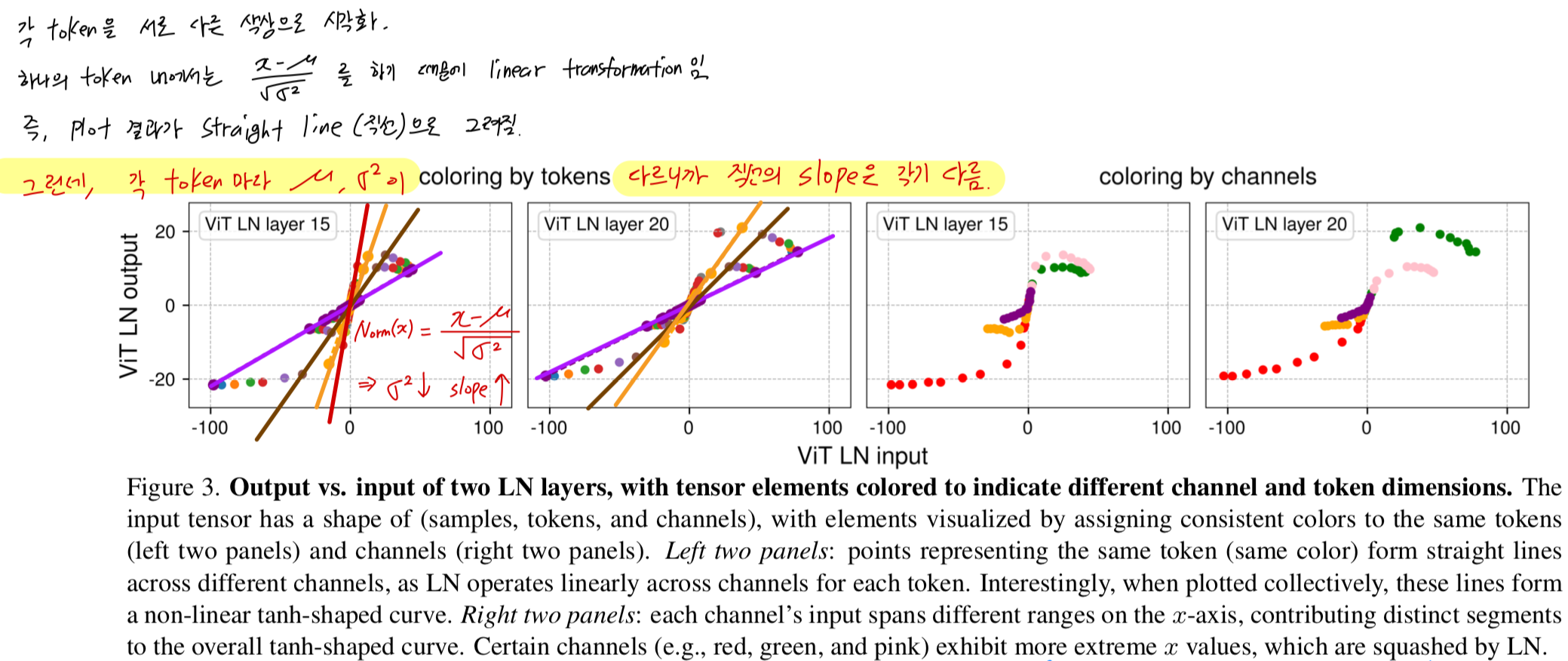 LN은 per-token 단위로 mean을 subtracting하고 standard deviation으로 dividing하기 때문에 input tensor를 linearly transform한다고 생각할 수 있지만...