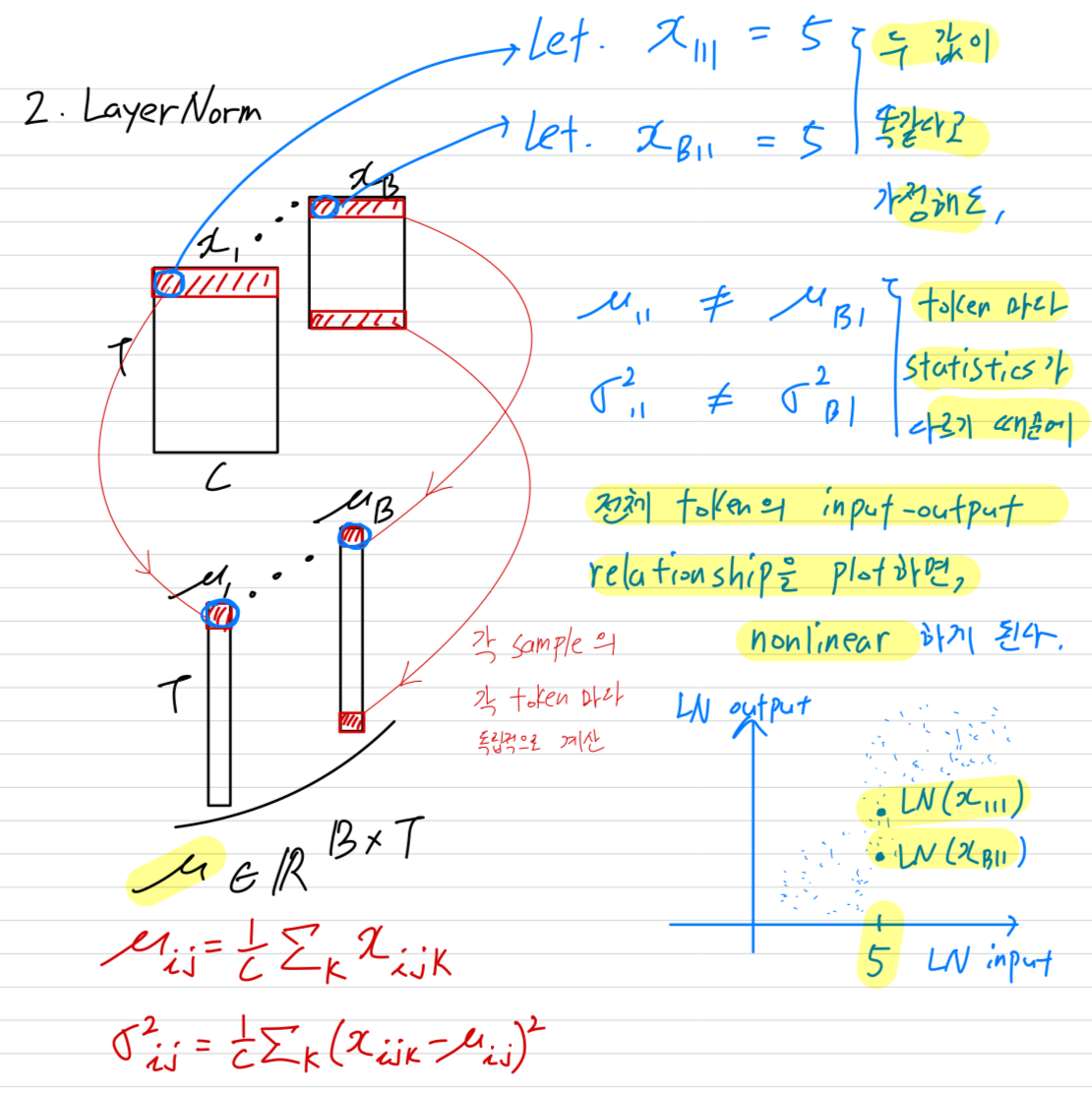 token마다 mean and stddev 값이 다르기 때문에 모든 activation들을 하나로 모아서 보면 전체적으로는 linearity가 유지되지 않는다.