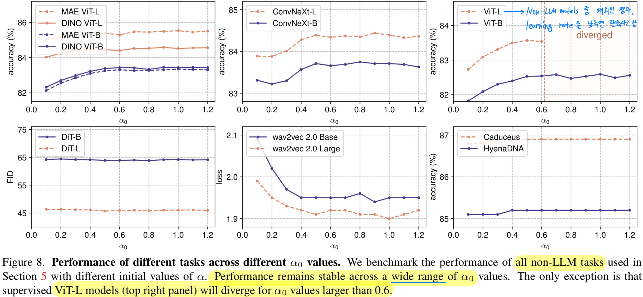 주요 예외는 supervised ViT-L experiment로, 가 0.6을 초과하면 tranining이 unstable해지고 diverge한다.