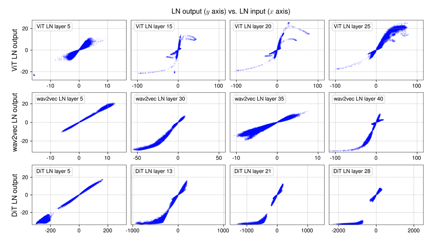 earlier LN layers (1st column of Figure 2)에서 input-output relationship이 linear하며, x-y plot에서 straight line에 가까운 모습을 보임을 발견했다.