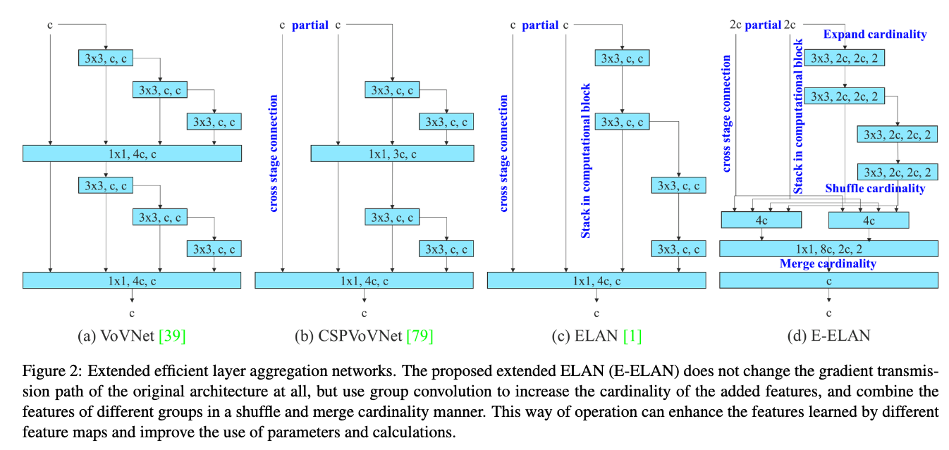 architecture 관점에서, YOLOv7은 기존의 YOLOv4 backbone CSPNet을 대체하기 위해 ELAN을 사용했고, large models을 설계하기 위해 E-ELAN을 제안함.