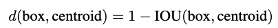 일반적인 k-means clustering은 Euclidean distance를 사용했는데, box의 크기가 클수록 Euclidean distance가 커지는 경향이 있어, IoU를 거리 측정 기준으로 사용.