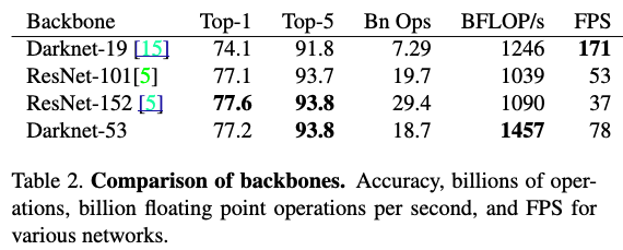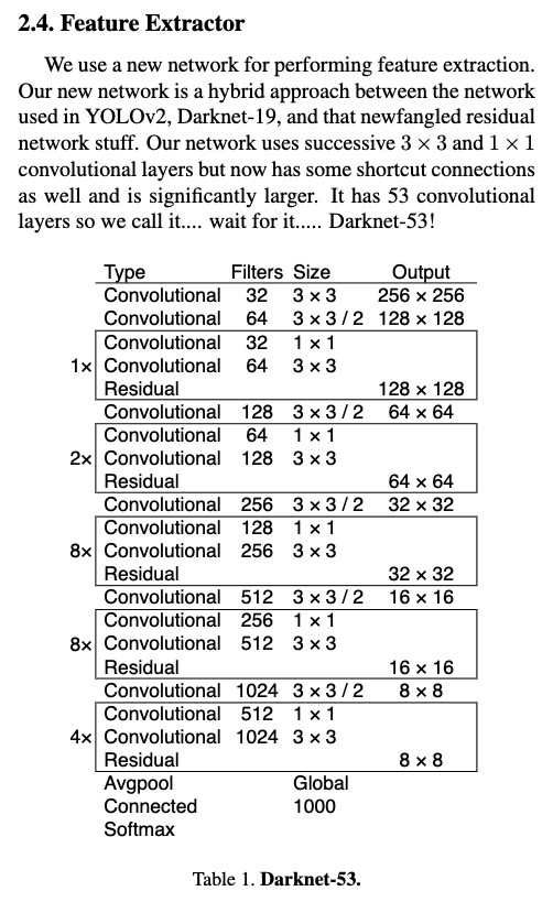 Feature Extractor로 Darknet-19에 대해서 1x1 conv, 3x3 conv로 deeper feature extraction network를 만들기 위해 shortcut connection을 추가하여 Darknet-53을 제안.