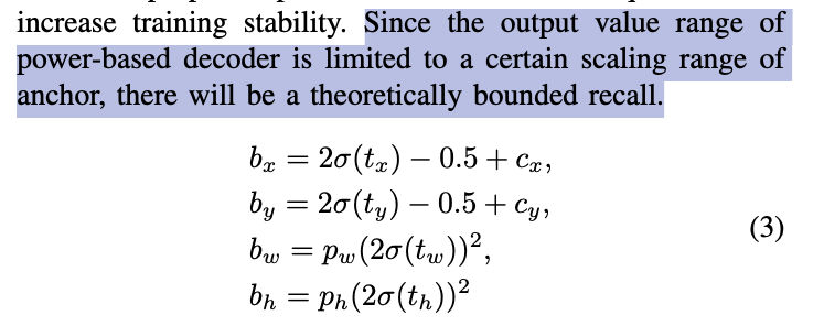 하지만 이 방식은 예측값의 범위를 제한하기 때문에, 이론적으로 model이 탐지할 수 있는 객체의 최대치, 즉 recall에 한계가 생기는 부작용이 있음.