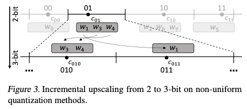 Figure 3은 clustering-based non-uniform quantization 방법을 사용하여 2-bit model에서 3-bit model로 변환하는 upscaling 과정을 시각화했다.
