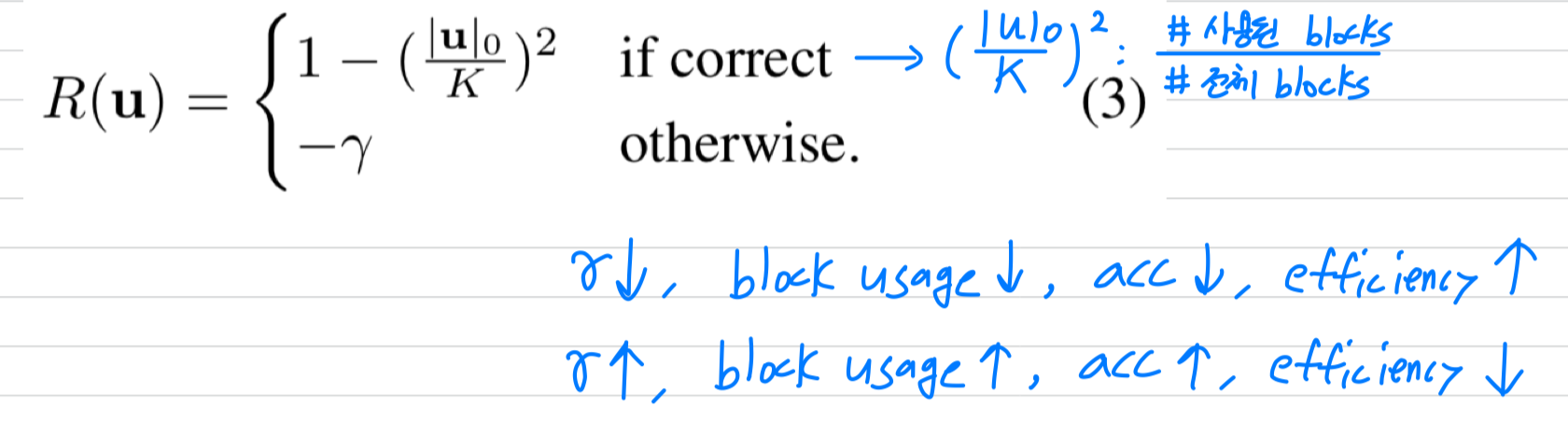 γ값을 작게 주면, model이 block을 더 사용하지 않아도 된다고 생각 ➡️ accuracy는 낮아지만 block usage(efficiency)는 높을 것