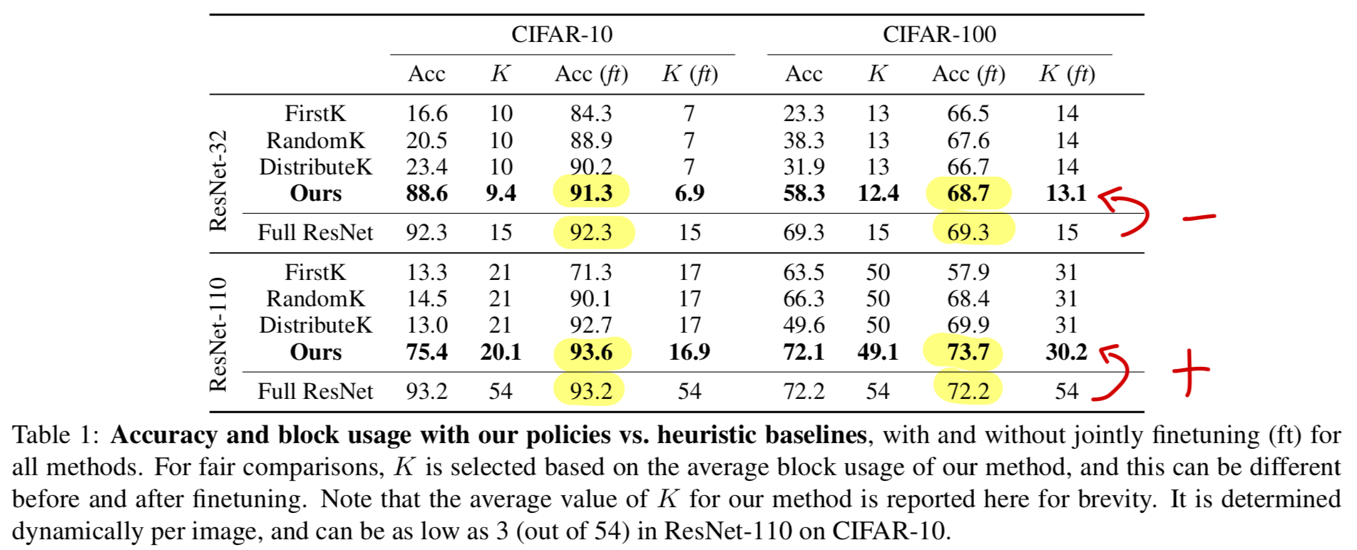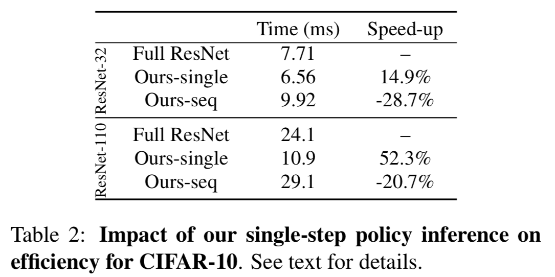 - CIFAR (ResNet-110)에 대한 policy network의 computation은 기존의 4.8%,