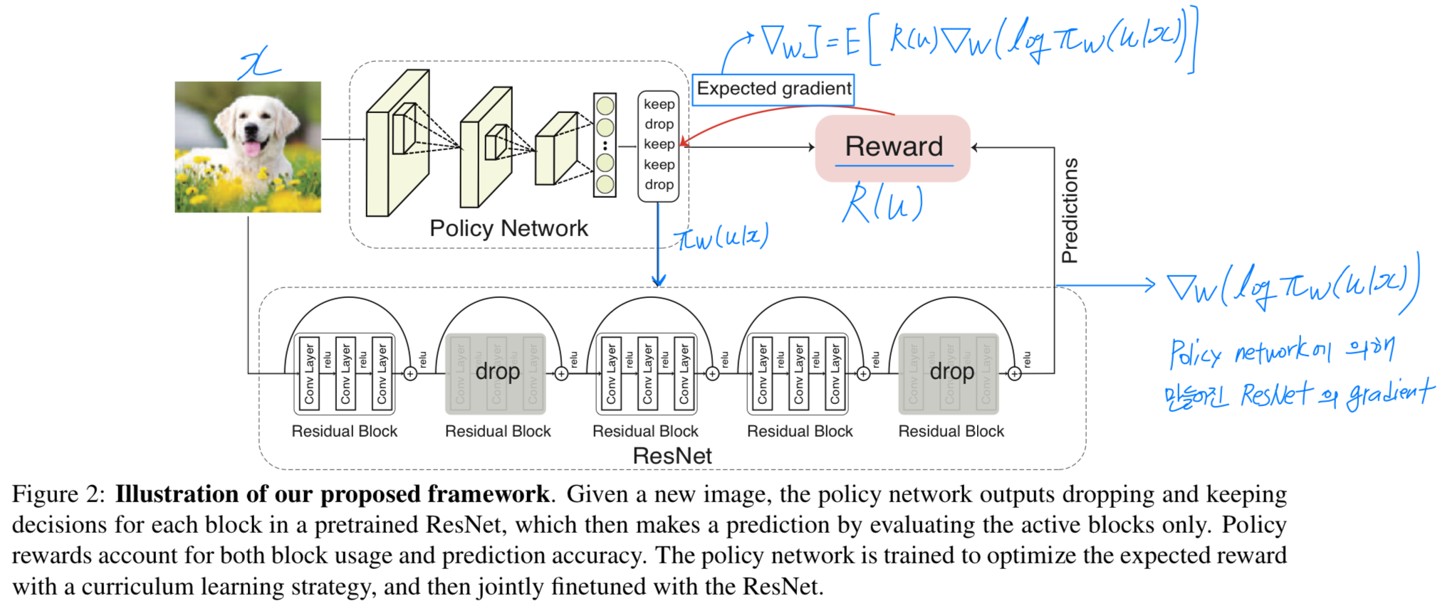 - w(u∣x)는 뭘까? (pocliy of block-dropping behavior as K-dimensional Bernoulli distribution 이라고 하긴 했는데... 잘 알지 못하겠음)