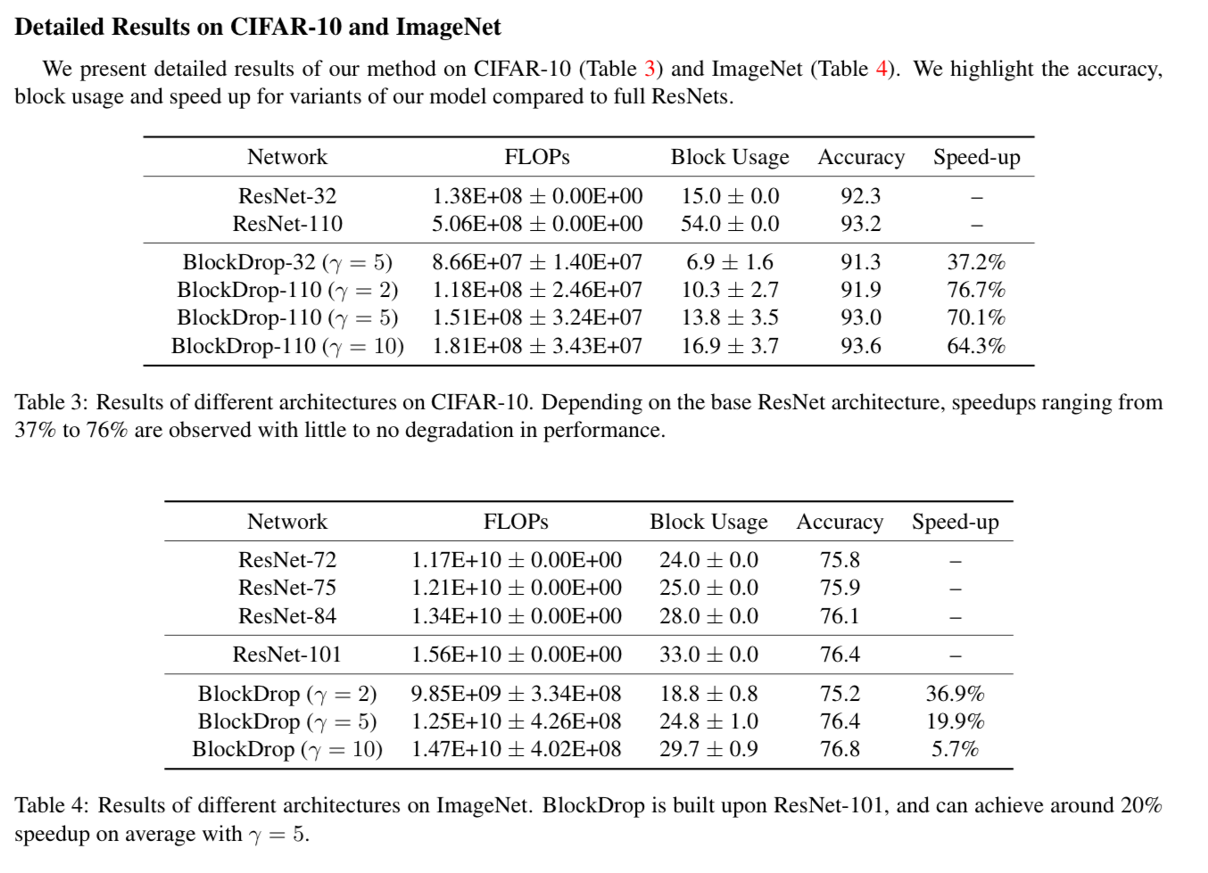 또한 BlockDrop은 ImageNet에서 ResNet-101 model의 속도를 20% 높이면서 동일한 76.4%의 top-1 accuracy를 유지.