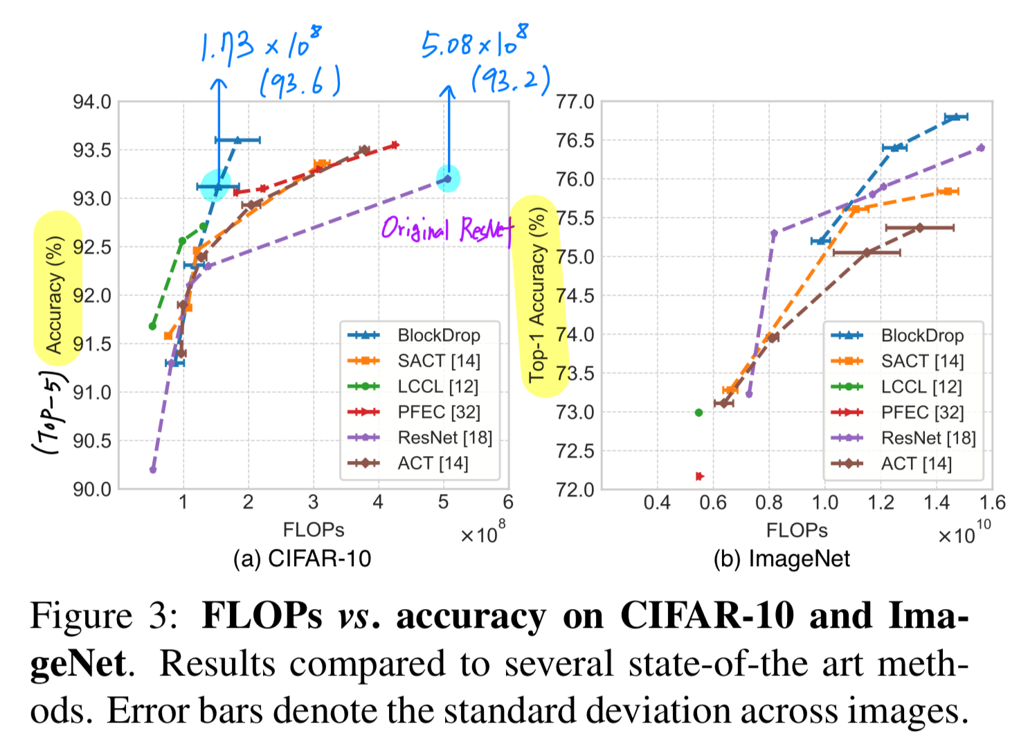 (BlockDrop의 FLOPs는 직접 부여하지 못하고, policy network의 학습에 의해서 결정될텐데..