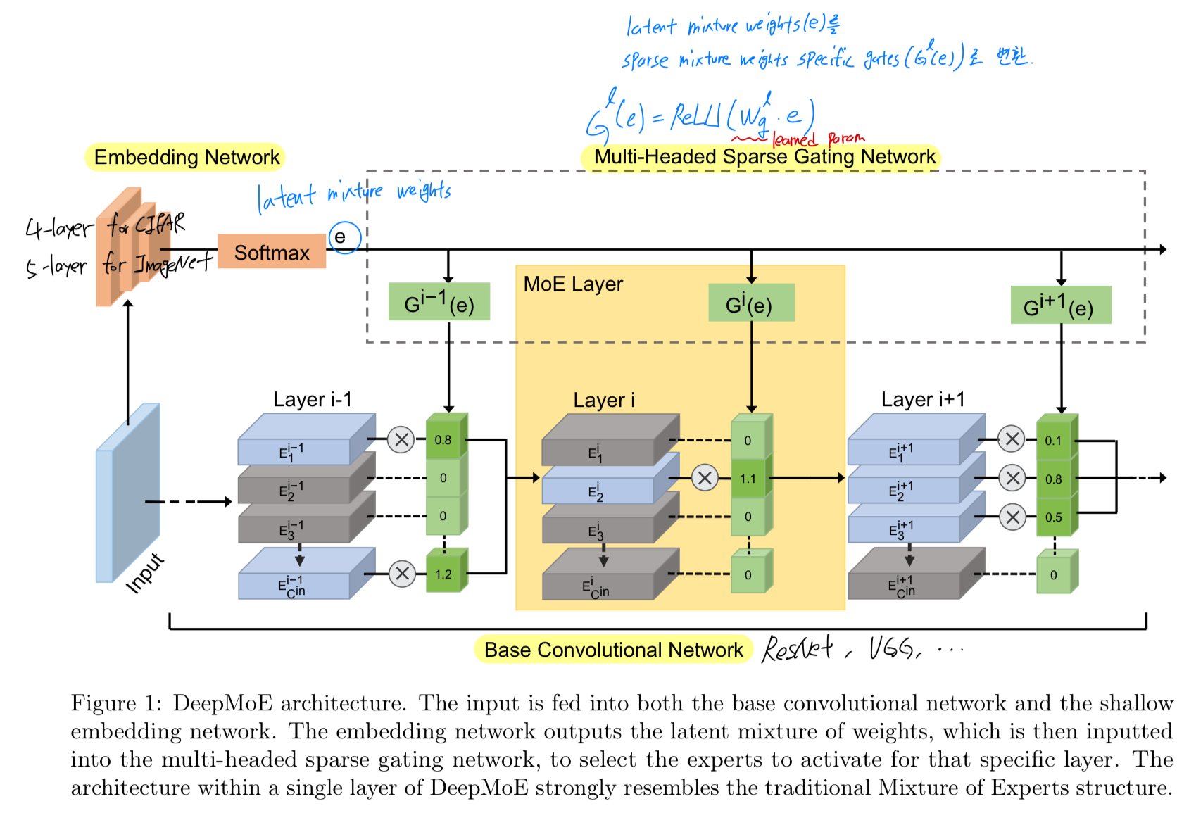 이 architecture는 a deep CNN, shallow embedding network, a multi-headed sparse gating network를 결합한 구조이다. (Fig. 1)