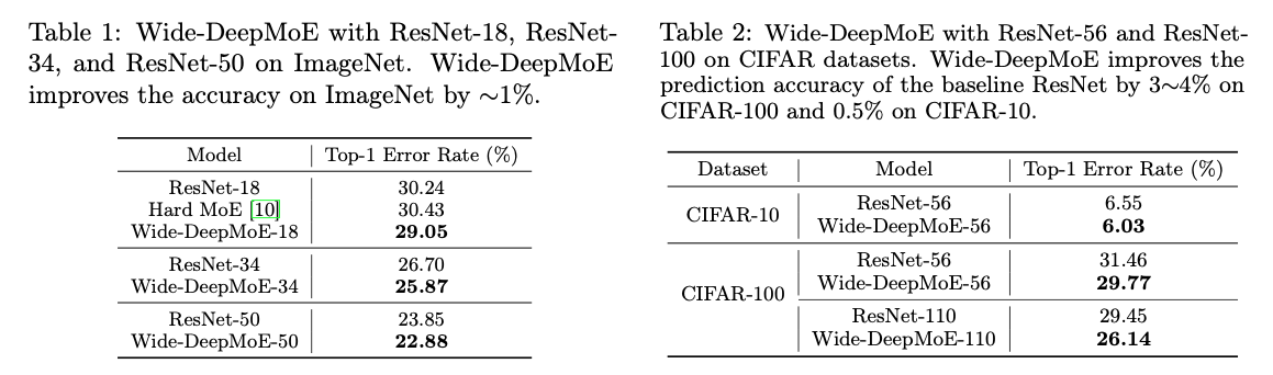 실험 결과, wide-DeepMoE는 standard ResNet보다 낮은 prediction error rate를 보임