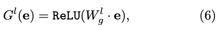 Wgl는 learned parameters로, ReLU 연산을 사용하여 latent mixture weights를 sparse layer specific gates로 변환한다.
