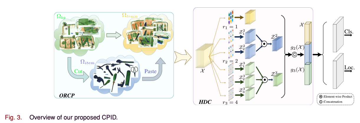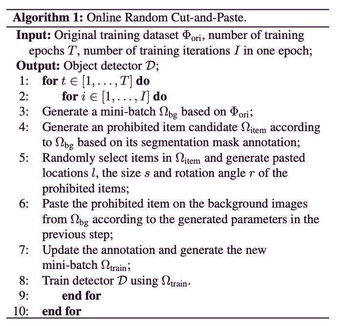 구체적으로, 우리의 ORCP(Online Random Cut-and-Paste)는 segmentation mask annotation에 따라 금지 물품을 cut(잘라내고) 금지 물품 candidate set 을 만든다.