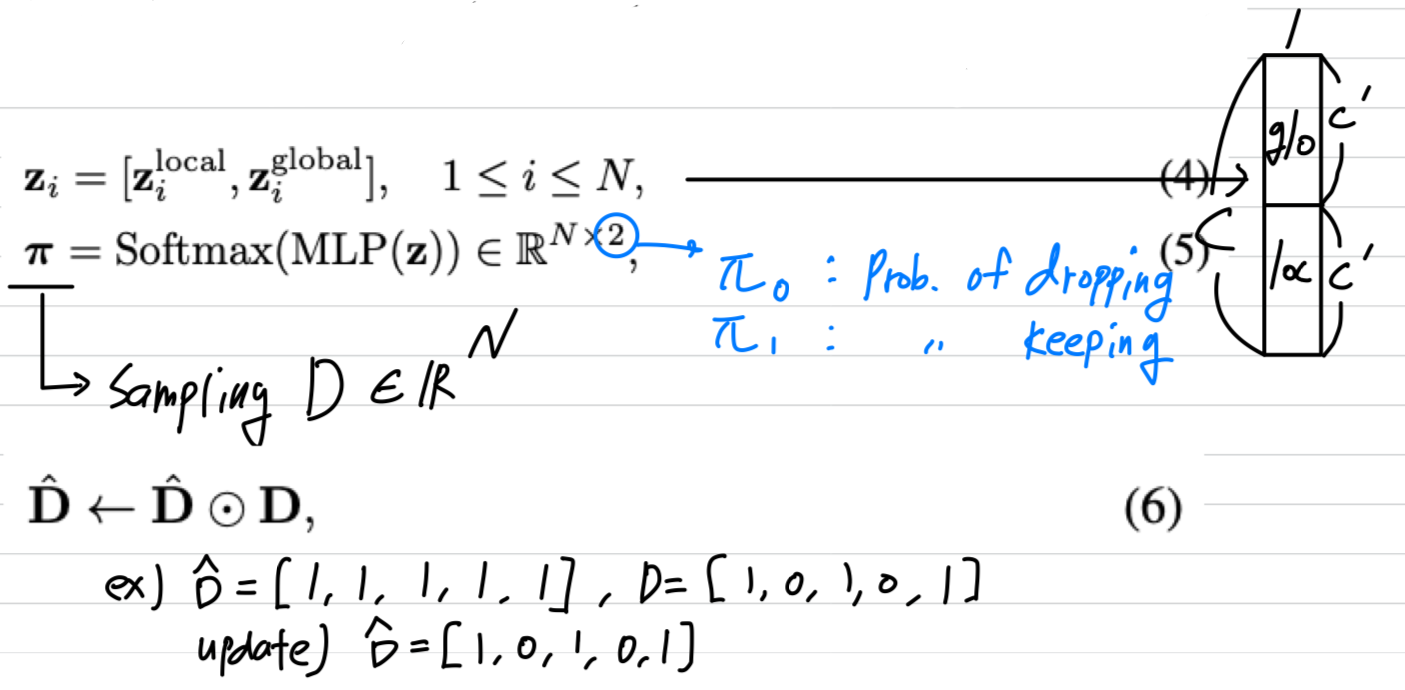 여기서 는 -th token에 대한 probability of dropping을 나타내고, 은 probability of keeping을 나타낸다.