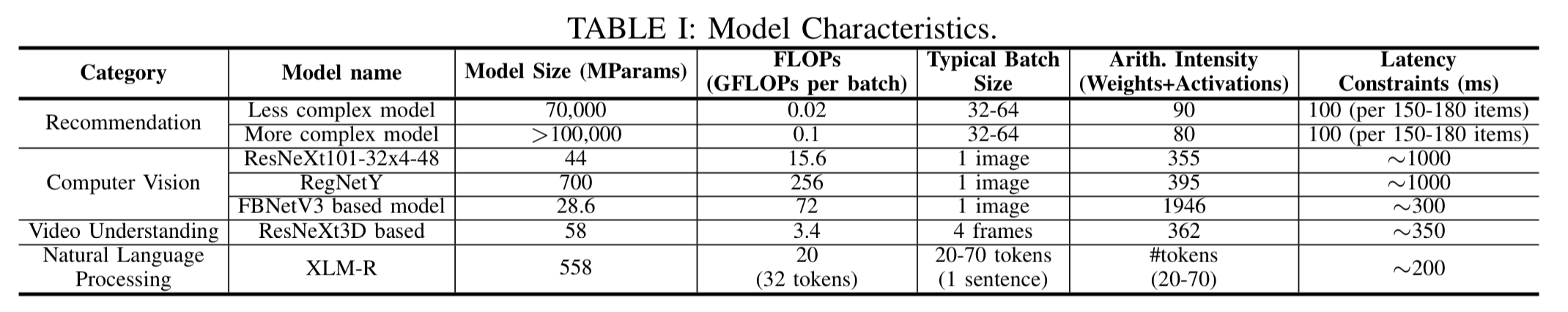 workload의 넓은 범주는 이전 연구에서 설명된 이후로 변하지 않았지만, model의 구체적인 사항은 변화했다.Recommendation system의 Latency 시간 요구 사항은 이전 연구에서 batch 당 요구 사항을 보고했기 때문에 크게 변하지 않았다.