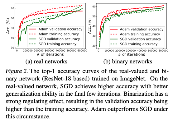 Binary Neural Networks, BNNs은 일반적으로 Adam optimization을 사용하여 얻어진다.