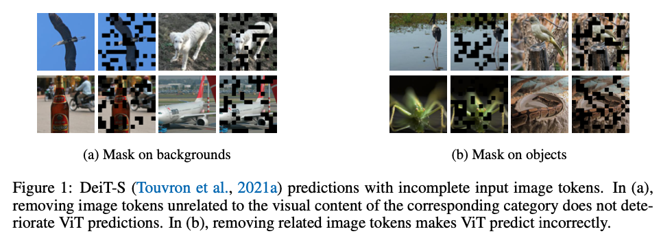 Fig. 1a에서와 같이 관련 없는 image token을 제거해도 ViT predictions에는 영향을 미치지 않는다.