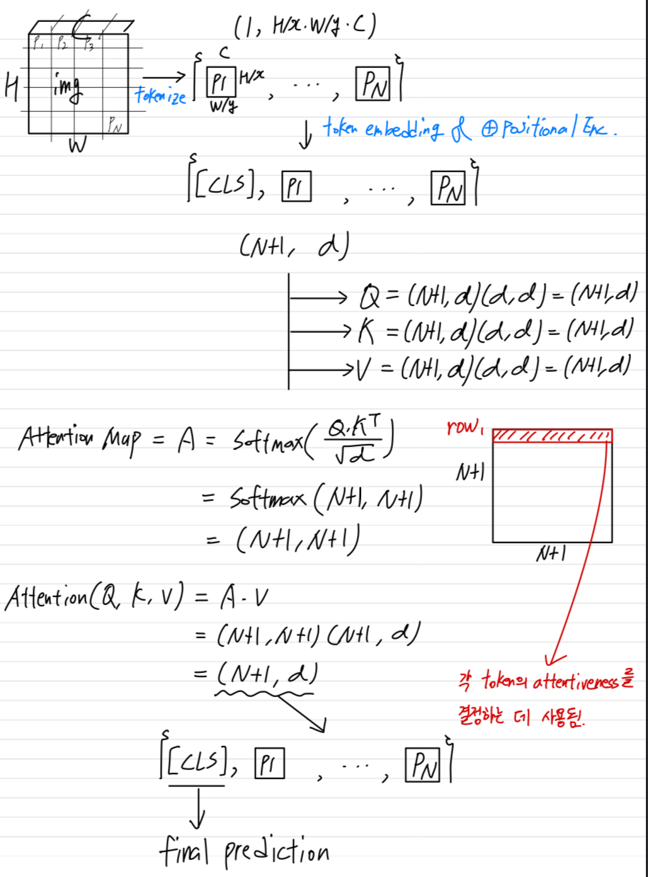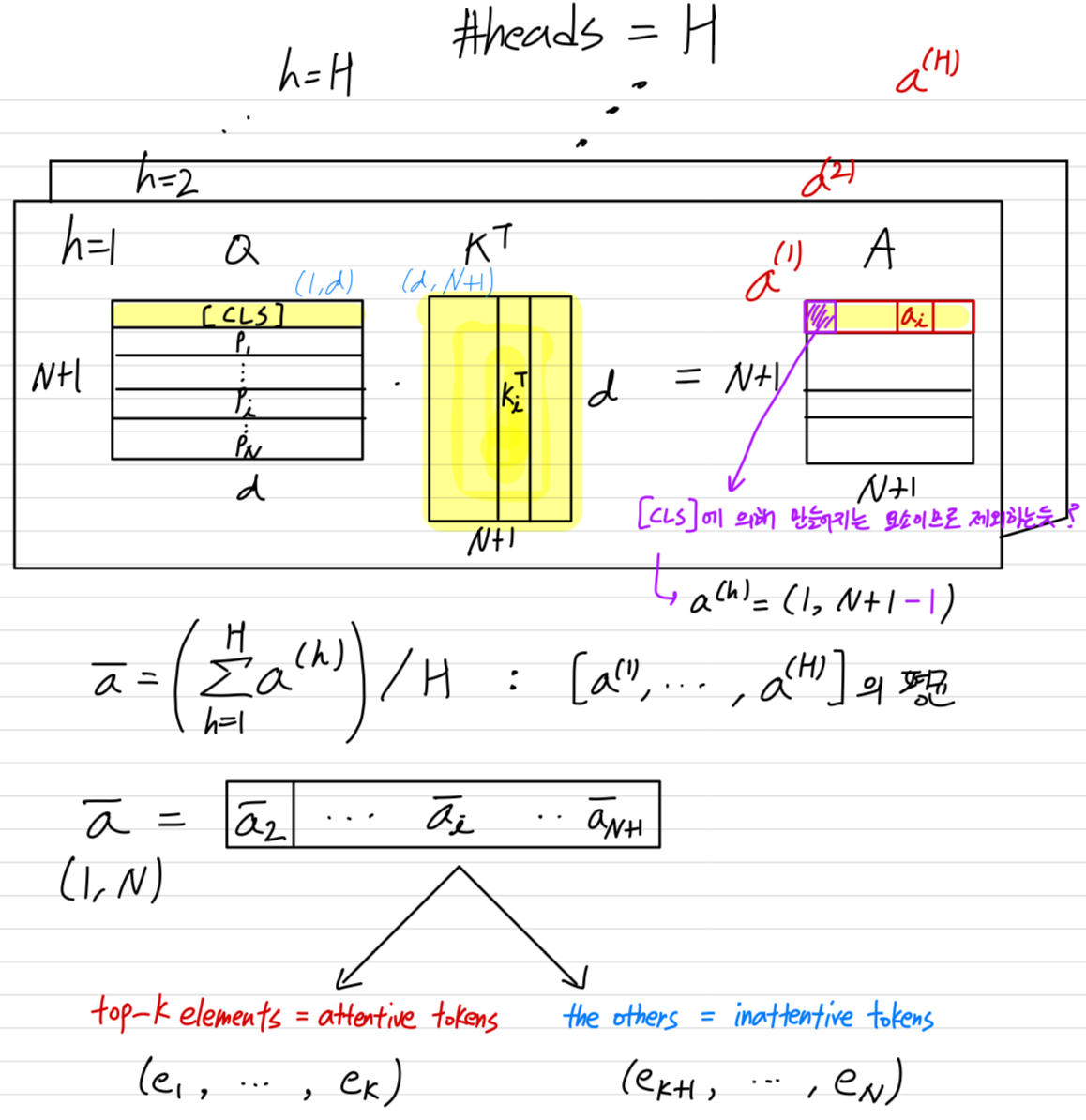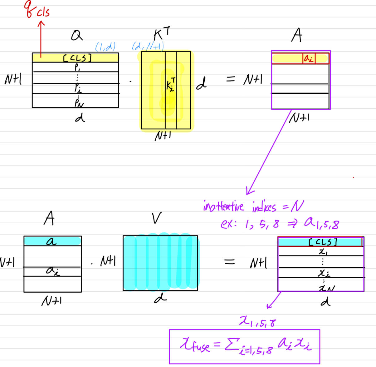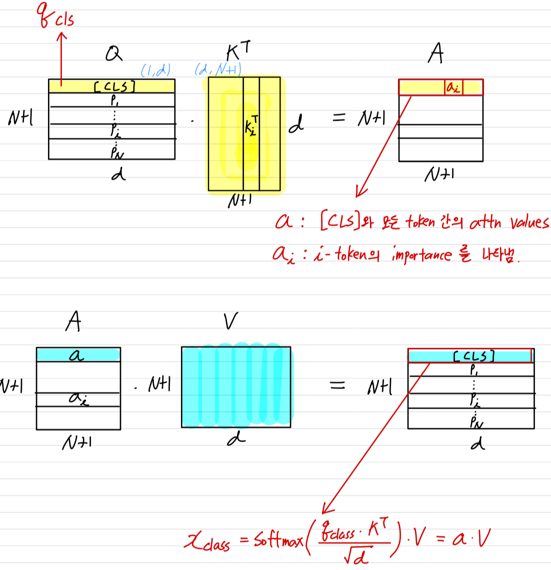 , K, and V는 각각 [CLS] query vector, Key matrix, and Vlaue matrix를 의미한다.
