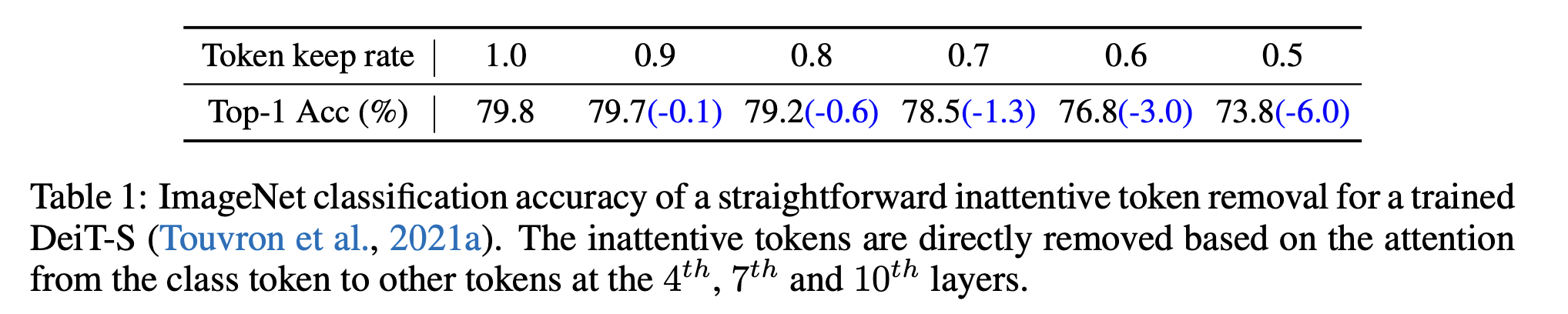 그러나, 이러한 token을 직접 제거하면 classification accuracy가 심각하게 저하된다는 것을 Table 1에서 보여주고 있다.