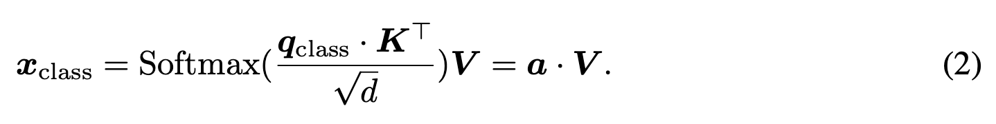 다시 말해, [CLS] token의 output 는 value vector 의 linear combination으로 표현되며, combination coefficients(Eq.2에서 로 표시된)는 [CLS]와 모든 tokens 간의 attention values이다.