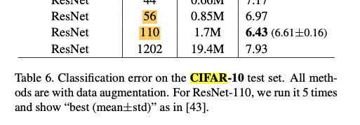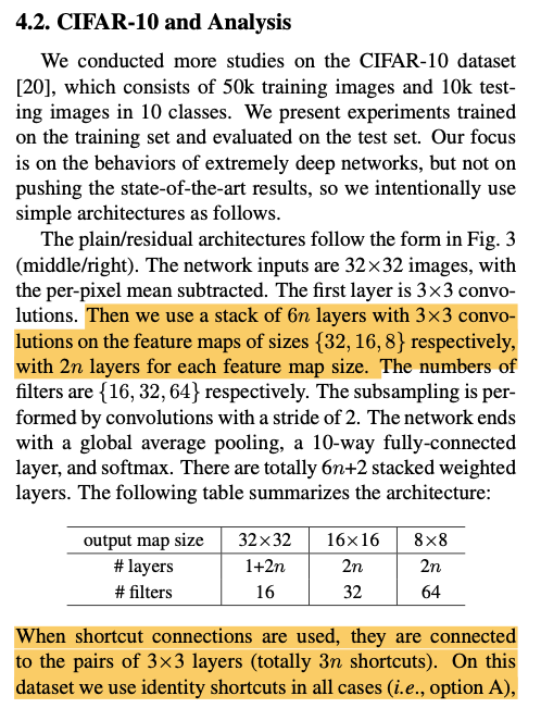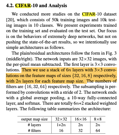 ResNets for CIFAR-10 model 정보는 ResNet 논문에서 찾을 수 있었다.