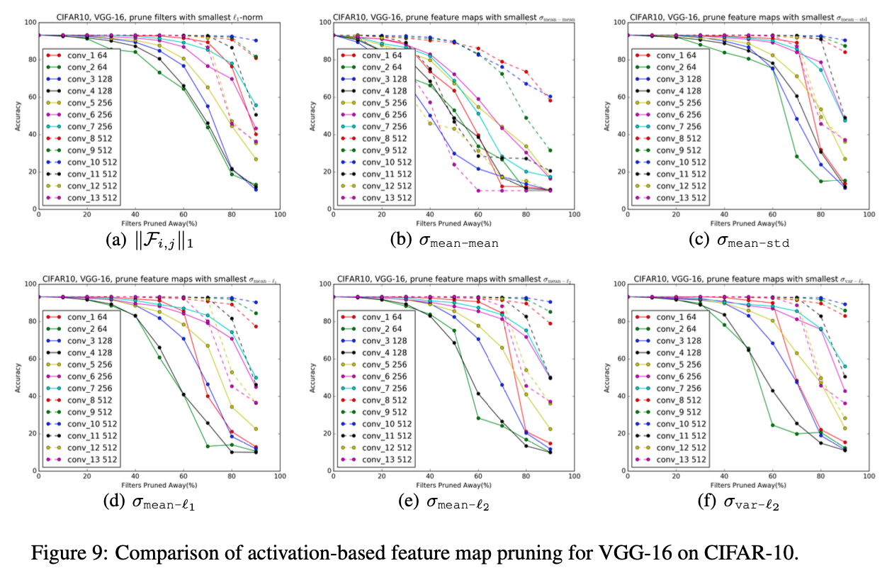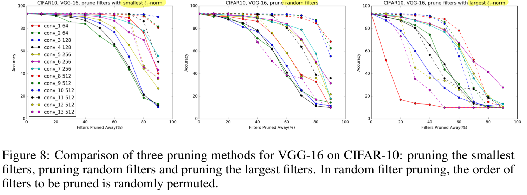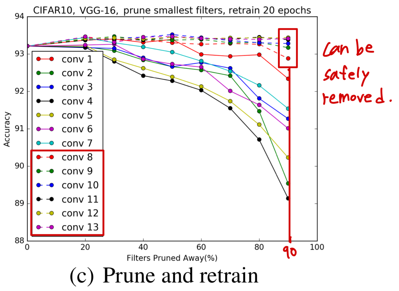 512개의 feature map을 가진 convolutional layer들의 거의 90%의 filter들은 안전하게 제거될 수 있다.